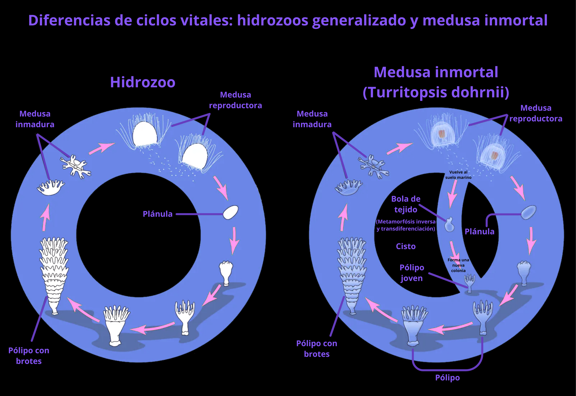 Su fama se debe a un proceso biológico único: puede revertir su ciclo vital, volviendo de su fase adulta a su fase juvenil (pólipo) en lugar de morir, lo que en teoría le permite evadir la muerte por envejecimiento.