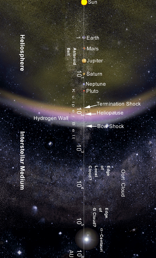 Un diagrama mostrando la extensión exterior de la heliosfera, la nube de Oort, y afuera de Alfa Centauri en una escala logarítmica de un millón de UA. Crédito: NASA