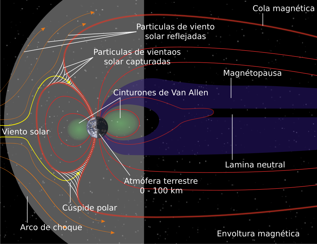 Las partículas cargadas (electrones y protones) quedan confinadas por el campo magnético, moviéndose en espiral a lo largo de sus líneas de fuerza y rebotando entre los polos. Esto reduce drásticamente la cantidad de radiación que llega a las capas bajas de la atmósfera. - Disipación de energía
