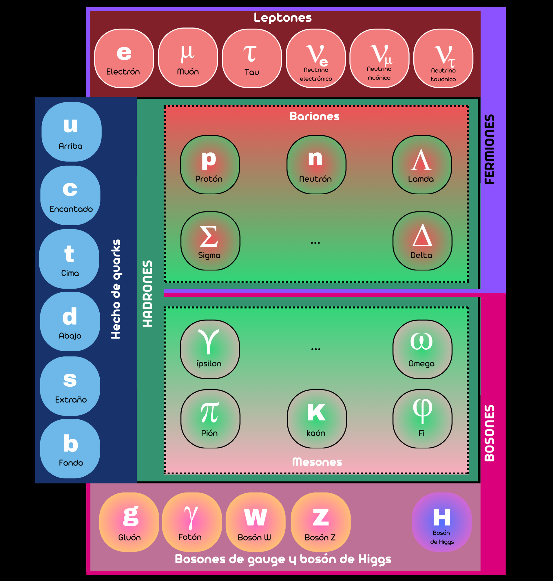 Por último, los hadrones son partículas compuestas por quarks, que se mantienen unidos gracias a la fuerza nuclear fuerte, y que se clasifican principalmente en dos familias: bariones (sistemas de tres quarks) y mesones (sistemas de un quark y un antiquark).