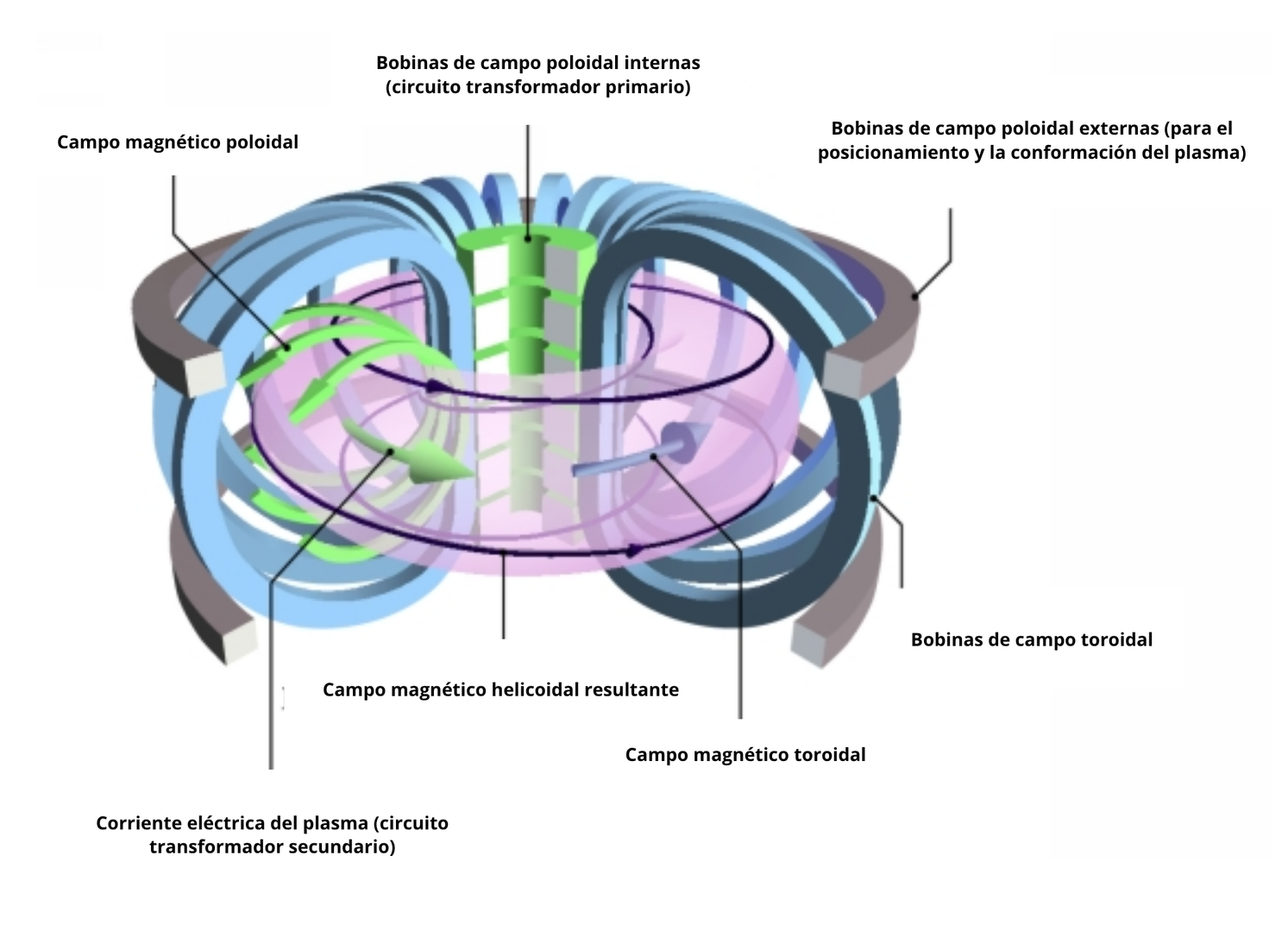 | Toroidal | Alrededor del eje principal | Bobinas toroidales | Confinar lateralmente el plasma |