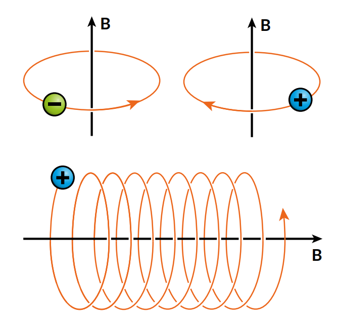 Movimiento de una partícula cargada (negativa o positivamente) en un campo magnético. Cuando la partícula se mueve perpendicularmente al campo magnético, empezará a moverse en círculos alrededor de la línea del campo magnético. Si la partícula también tiene una velocidad en la dirección del campo magnético, la partícula seguirá una trayectoria helicoidal alrededor de la línea de campo magnético. Este movimiento circular/helicoidal alrededor de la línea de campo magnético se denomina gyromotion. Crédito: Fusenet.eu