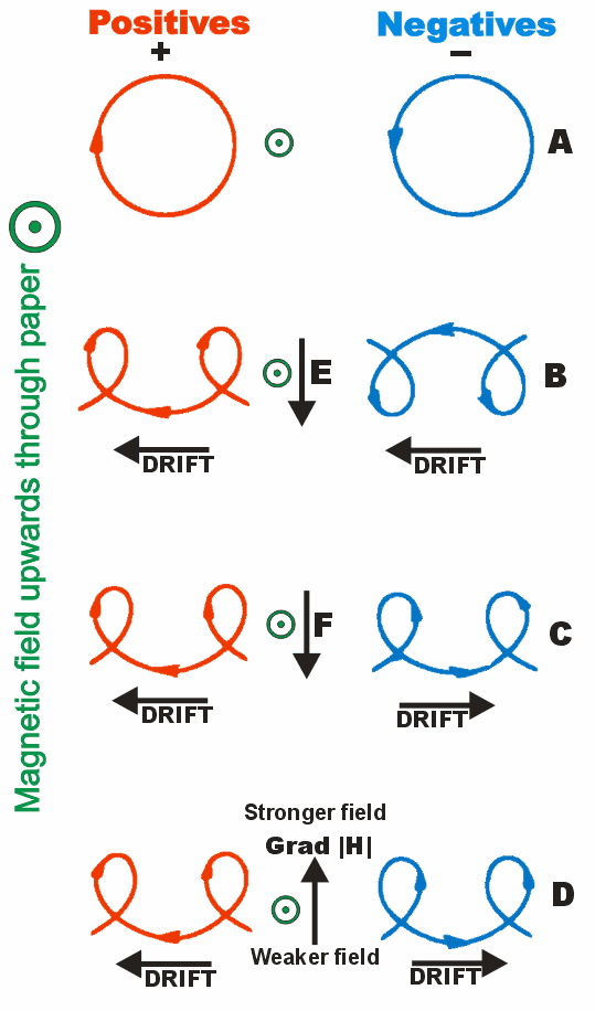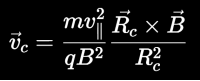 Esa variación de intensidad y curvatura en el campo produce fuerzas adicionales sobre las partículas cargadas. El resultado es una velocidad de deriva perpendicular tanto a B como al gradiente de B, así como una deriva por curvatura: