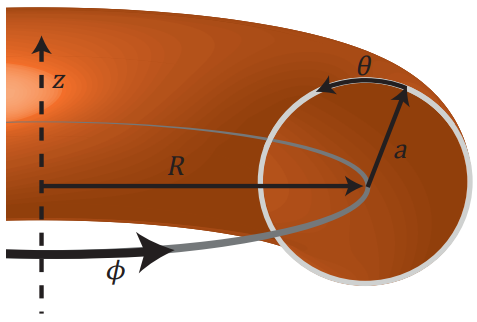 Esquema de la geometría de un toroide. Se indican el radio mayor (R) y el radio menor (a) del toroide. También se dibujan las direcciones toroidal (φ) y poloidal (θ). Crédito: Jens Peter Frankemölle/TU Eindhoven.