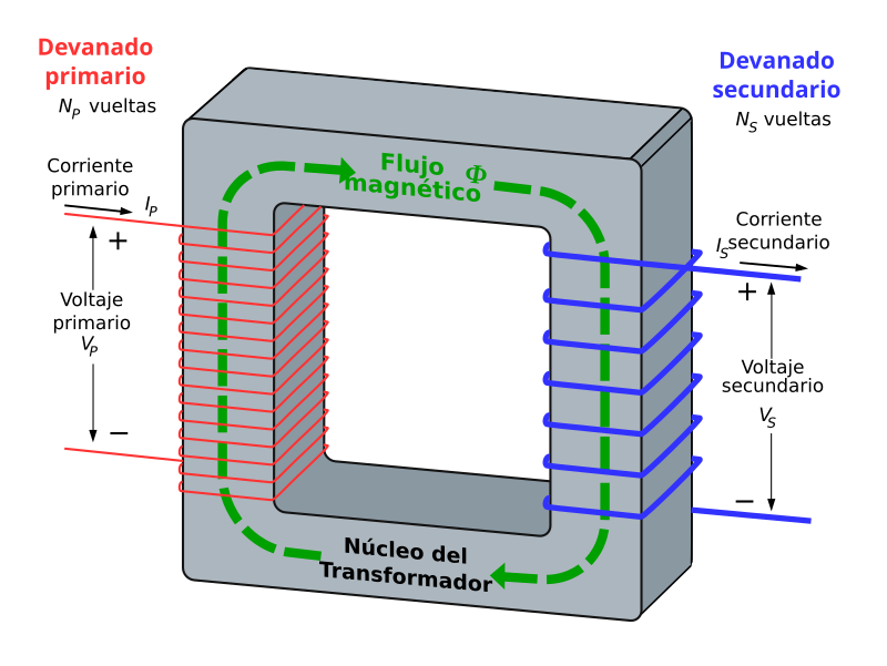 Esquema de un transformador. Crédito: https://commons.wikimedia.org/wiki/File:Transformer3d_col3_es.svg