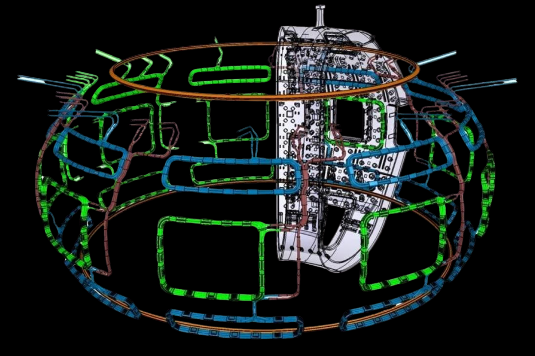 Sistema de campo toroidal. Genera un campo magnético toroidal (alrededor del eje principal del toro) que confina el plasma dentro de la cámara, evitando que toque las paredes.