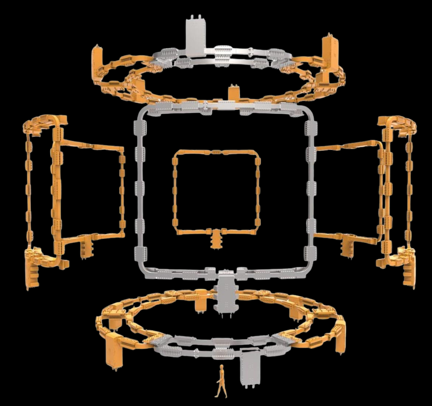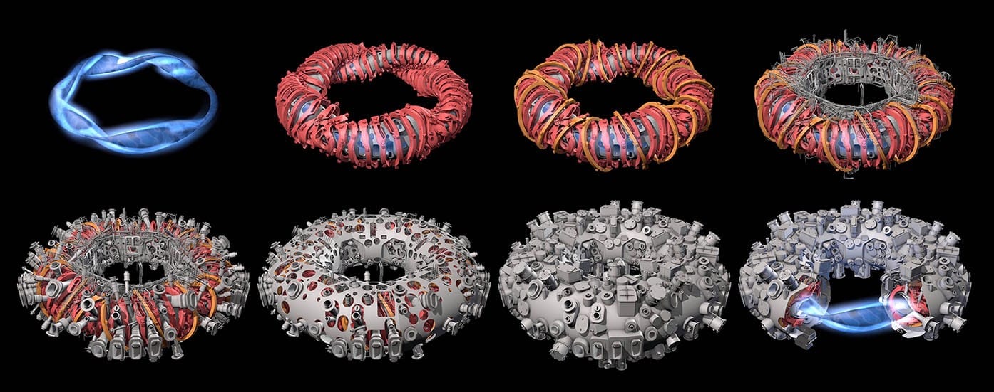 - El campo helicoidal se genera mediante múltiples bobinas toroidales 3D, cuidadosamente diseñadas con formas no planas.