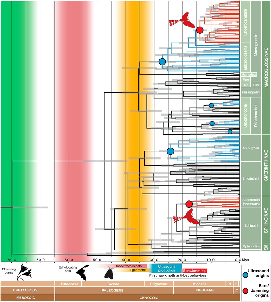 Filogenia molecular calibrada en el tiempo de las polillas halcón que muestra la evolución de las orejas, la producción de ultrasonidos y la interferencia con el sonar de los murciélagos. Las ramas muestran un IC del 95 % (gris) a partir de la distribución posterior de los árboles. Las ramas azules denotan clados que crean ultrasonidos en respuesta al tacto; los clados rojos indican grupos que responden tanto al tacto como al ataque de ecolocalización de los murciélagos. Los puntos azules indican el origen de la producción de ultrasonidos; los puntos rojos indican el origen previsto de las orejas y la interferencia con el sonar de los murciélagos. Los grupos externos se excluyen de la figura”. Crédito: Tempo and mode of antibat ultrasound production and sonar jamming in the diverse hawkmoth radiation | PNAS