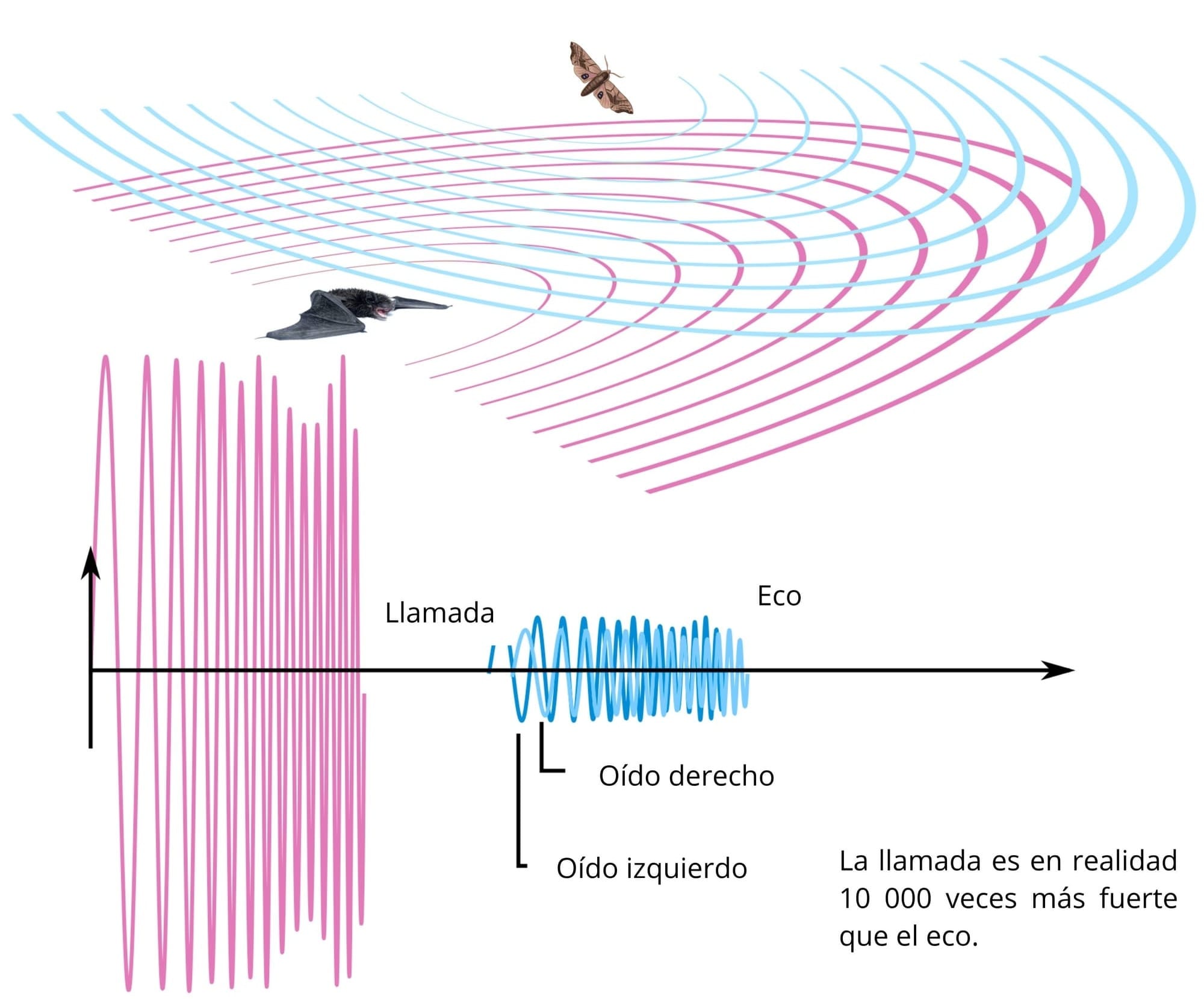 El murciélago emite un pulso ultrasónico → el sonido rebota en los objetos → el eco regresa → el cerebro calcula distancia, tamaño, textura y movimiento.