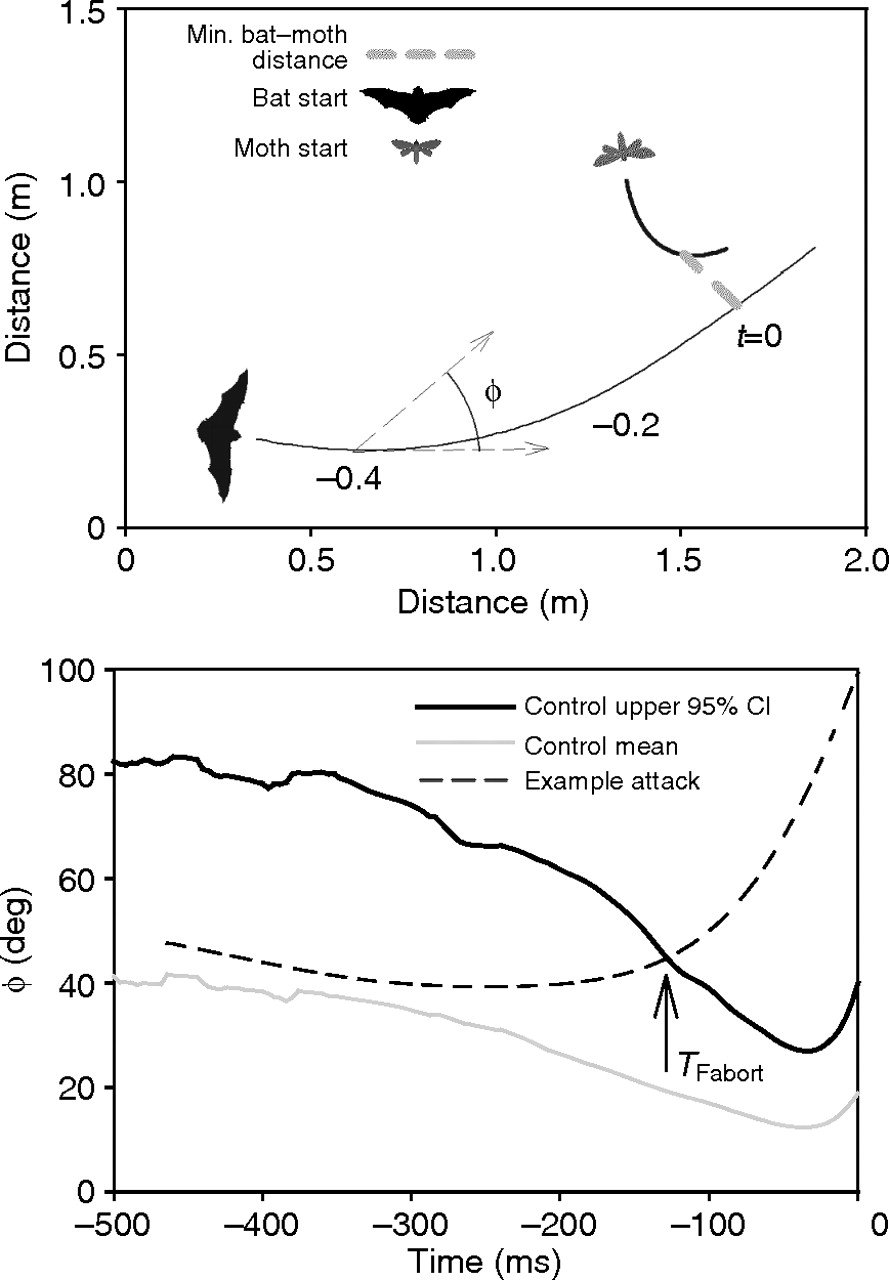 Diagrama que ilustra los parámetros de vuelo de los murciélagos. (A) Vista aérea de un murciélago atacando a una polilla. En cada momento, φ se mide como el ángulo entre el vector de vuelo del murciélago y el vector murciélago-polilla. La distancia mínima entre el murciélago y la polilla es uno de los dos parámetros de respuesta de vuelo medidos en cada ataque. (B) Gráficos de tiempo frente a φ de la media y el intervalo de confianza superior del 95 % de 20 ataques exitosos a polillas de control, así como del ataque mostrado en A. TFabort, el segundo parámetro de vuelo, es el tiempo en un ataque en el que φ excede el intervalo de confianza superior del 95 % de los ataques de control. El punto de distancia mínima entre el murciélago y la polilla se utiliza como punto de tiempo cero para cada ataque. Crédito: https://journals.biologists.com/jeb/article/214/14/2416/918/How-do-tiger-moths-jam-bat-sonar