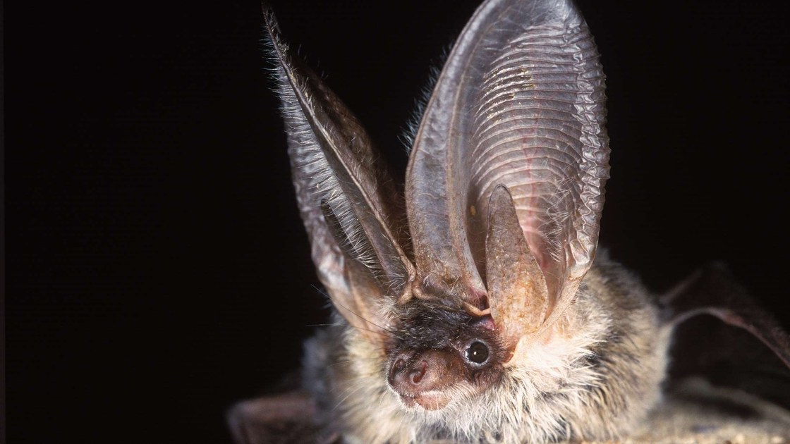 Fotografía de un ejemplar de murciélago orejudo gris (Plecotus austriacus) donde se puede apreciar claramente la envergadura de sus orejas.