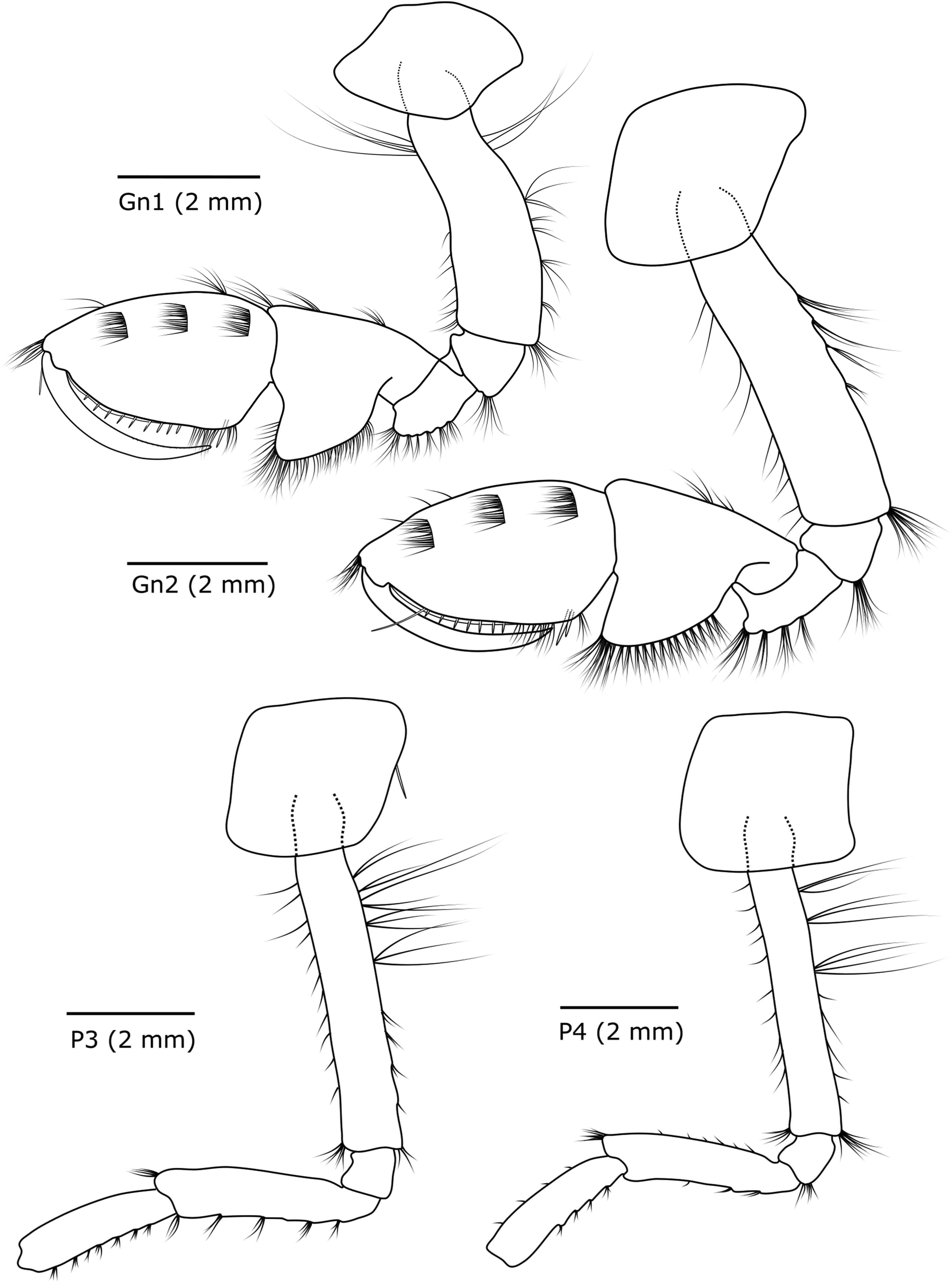 Dulcibella camanchaca gen. nov. sp. nov. Holotipo hembra (MNHNCL AMP-15974). Gn1: gnatópodo izquierdo 1. Gn2: gnatópodo izquierdo 2. P3: pereópodo izquierdo 3. P4: pereópodo izquierdo 4. Crédito: https://www.tandfonline.com/doi/10.1080/14772000.2024.2416430#d1e1359
