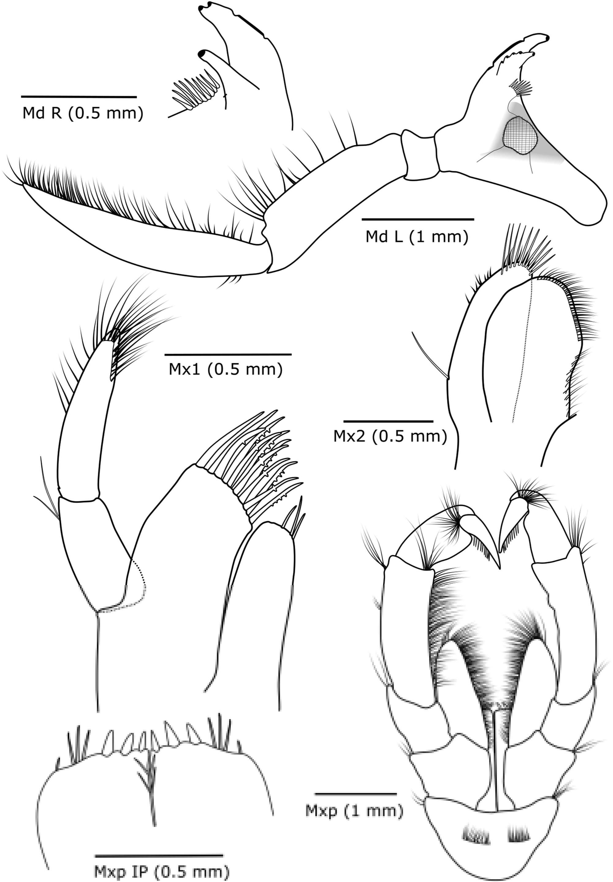 Dulcibella camanchaca gen. nov. sp. nov. Holotipo hembra (MNHNCL AMP-15974). Md R: mandíbula derecha ampliada. Md L: mandíbula izquierda. Mx1: maxilar izquierdo 1. Mx2: maxilar izquierdo 2. Mxp: maxilípedo completo. Mxp IP: placa interna del maxilípedo ampliada. Crédito: https://www.tandfonline.com/doi/10.1080/14772000.2024.2416430#d1e1359