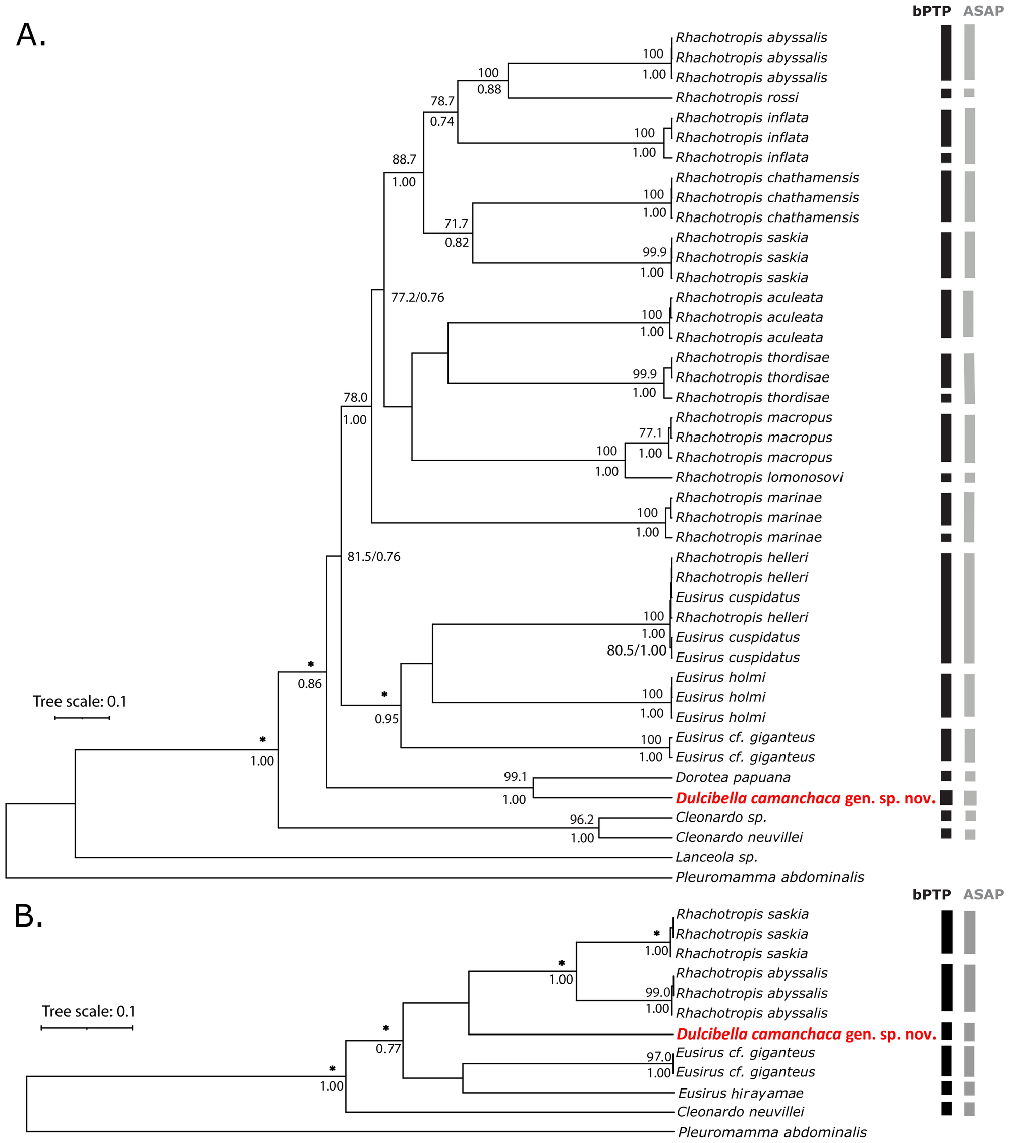- Nuevo género y especie: No sólo es una especie nueva, sino que representa un género completamente nuevo: "El ADN respaldó la distinción filogenética de Dulcibella camanchaca (gen. nov. sp. nov.), proporcionando una segunda línea de evidencia sólida para justificar la creación de un nuevo género. Dulcibella mostró una diferencia del 17,3 % en la distancia p con respecto a Dorotea papuana, superando el umbral habitual para diferenciar géneros (superior al 15 %). Su ubicación monofilética en el árbol del gen COI refleja las similitudes morfológicas compartidas entre Dorotea y Dulcibella, en particular el telson débilmente hendida y un proceso espinoso distal en el pedúnculo del uropodo 1. Sin embargo, a pesar de esas características compartidas y de la afinidad nominal, Cleonardo se situó en la base de todos los demás géneros de Eusiridae. Es importante destacar que la filogenia basada en COI solo abarca una parte de la diversidad descrita de Eusiridae, ya que nueve géneros carecen de representación y la mayoría de las especies conocidas no están incluidas. Dentro de los géneros representados, las distancias p de Eusirus y Rhachotropis fueron elevadas, lo que sugiere una diversidad genérica más alta y críptica. La familia Eusiridae ha sido sistemáticamente dinámica, con la inclusión temporal de tres familias adicionales y su traslado desde la suborden Senticaudata a la suborden Amphilochidea. Los futuros estudios deberían centrarse en la sistemática filogenética de toda la familia y superfamilia Eusiridae, lo que probablemente conducirá al descubrimiento de diversidad oculta y a una reorganización taxonómica más precisa." Crédito: https://www.tandfonline.com/doi/10.1080/14772000.2024.2416430#d1e1359