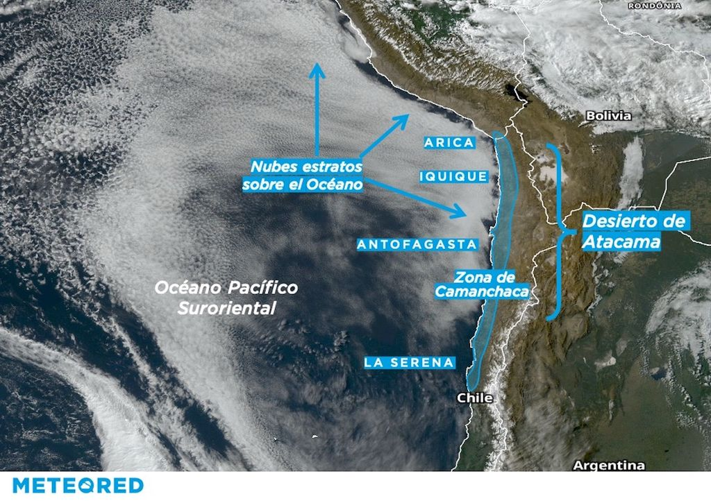 En azul la zona donde es frecuente el fenómeno denominado camanchaca. Crédito: https://www.meteored.cl/noticias/ciencia/la-camanchaca-la-gran-fuente-humedad-del-desierto-de-atacama.html