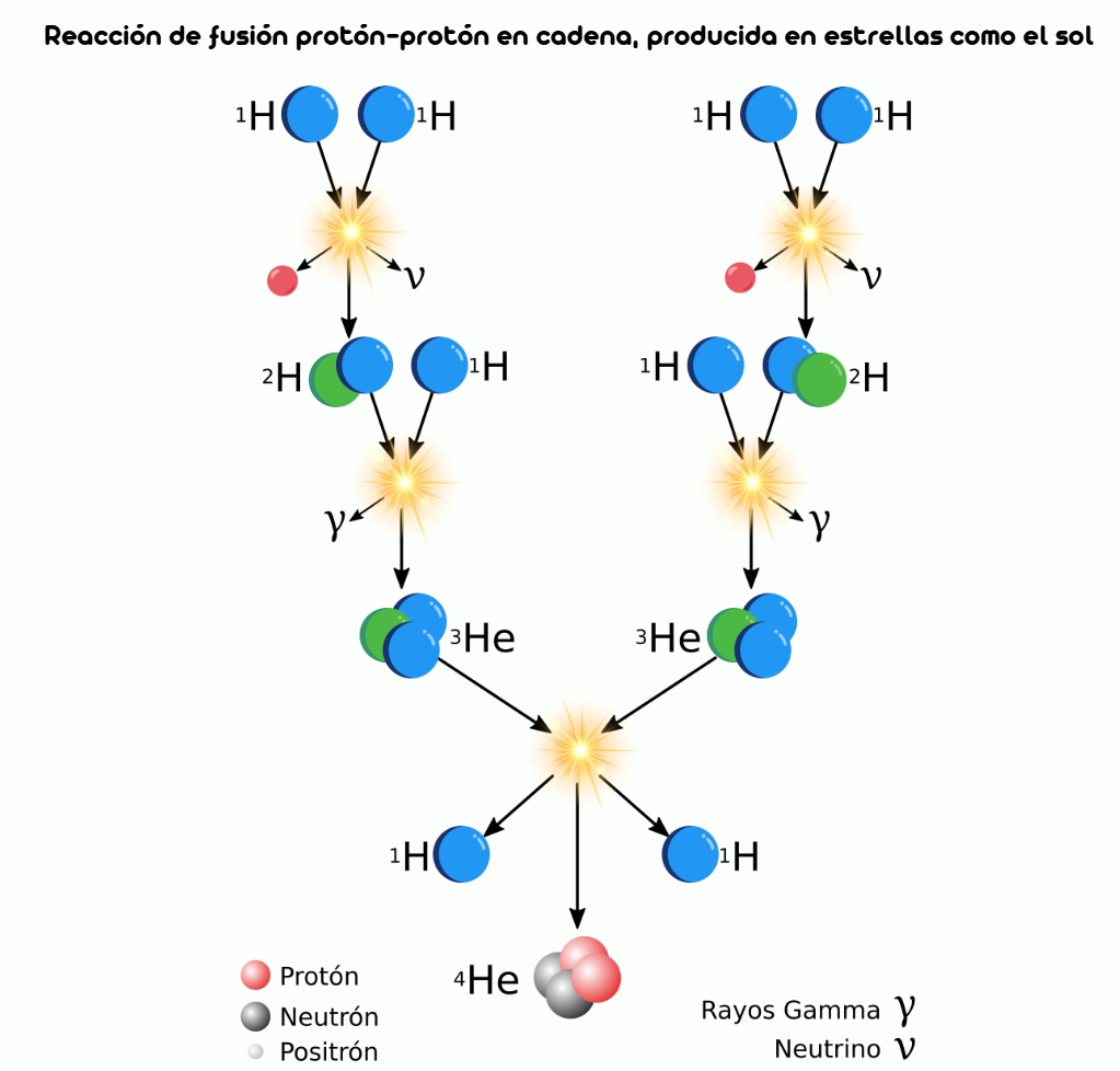 La energía de las estrellas proviene de las reacciones de fusión que tienen lugar en su interior. En el núcleo del Sol reinan condiciones extremas: temperaturas de 15 millones de grados y presiones aplastantes. Allí, los núcleos de hidrógeno (protones) se mueven tan rápido que pueden superar su repulsión eléctrica y fusionarse para formar helio.