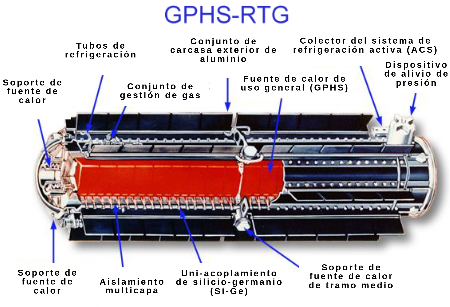 - Peso de cada RTG: 37,7 kg, incluyendo unos 4,5 kg de Pu-238.