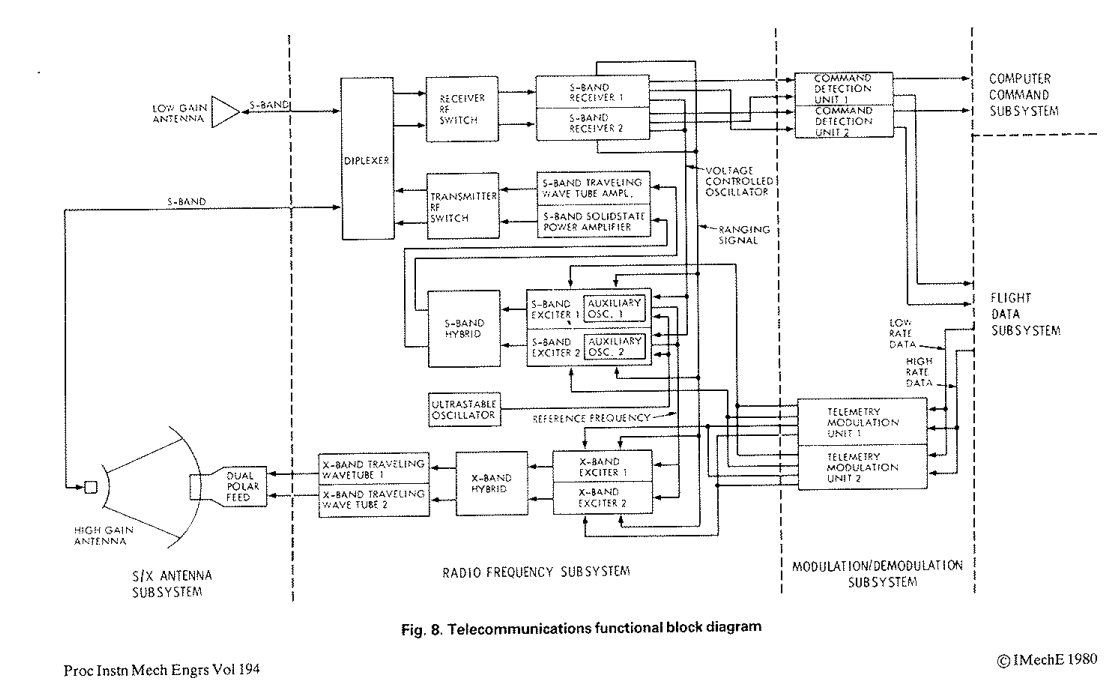 Diagrama funcional de bloques de telecomunicaciones. Crédito: The Voyager Spacecraft, Raymond L. Heacock. The Institution of Mechanical Engineers. Vol 194 No. 28.
