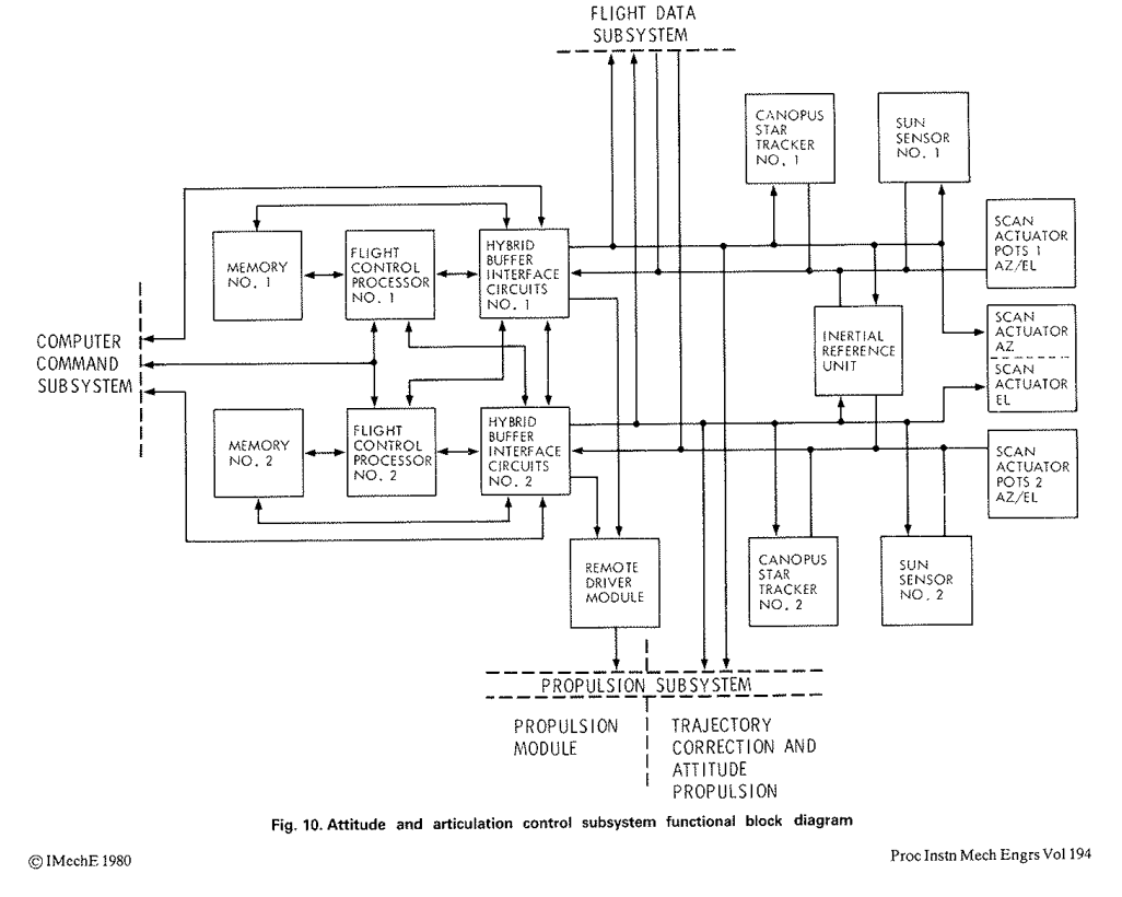 Diagrama funcional del subsistema de control de actitud y articulación. Crédito: The Voyager Spacecraft, Raymond L. Heacock. The Institution of Mechanical Engineers. Vol 194 No. 28.
