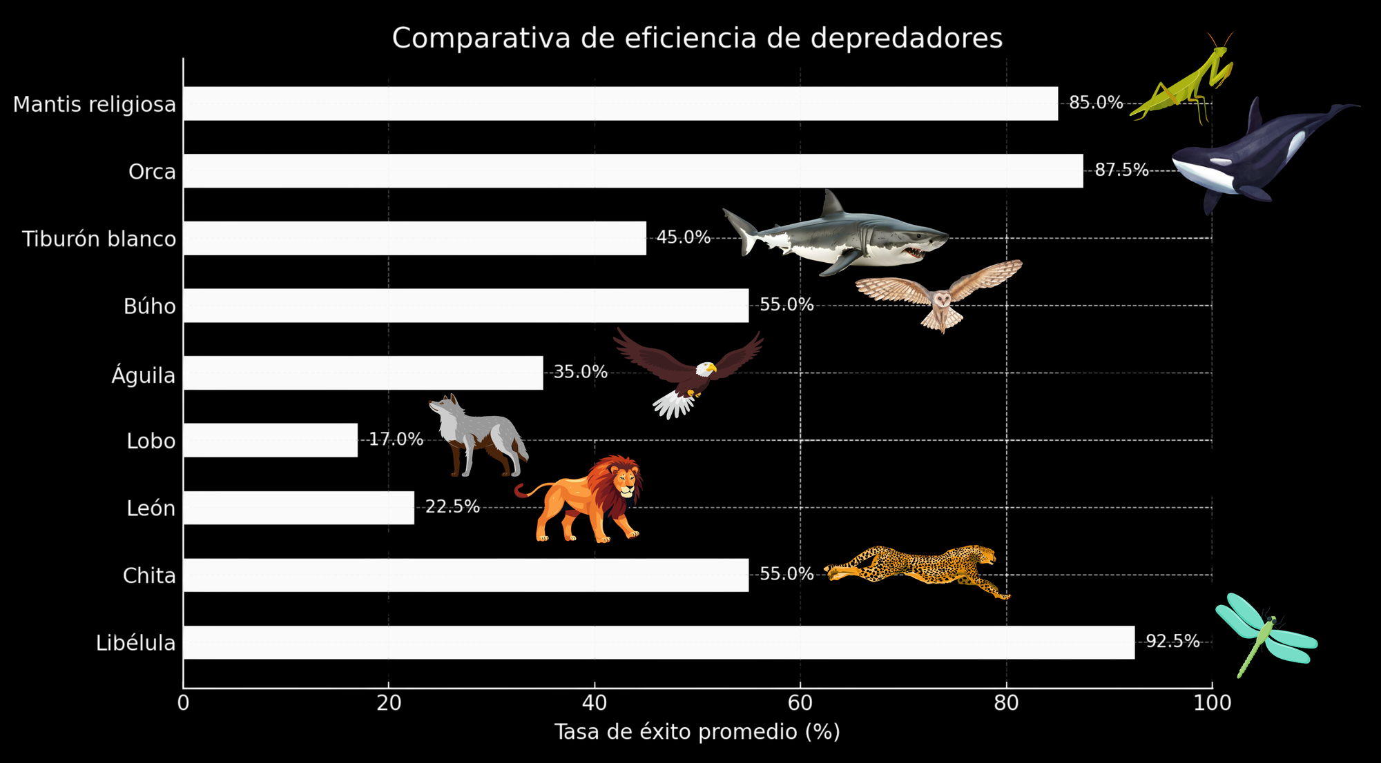 Mientras otros depredadores tienen tasas variables (águilas ~30–40%, lobos ~14–20%), las libélulas llegan regularmente al 90–95%. Evaluando a depredadores sociales e inteligentes como la orca, la competencia está algo más reñida (llegan a alcanzar casi el 90% trabajando en grupo). Sin embargo, la libélula sigue siendo la campeona si evaluamos la relación esfuerzo-recompensa.