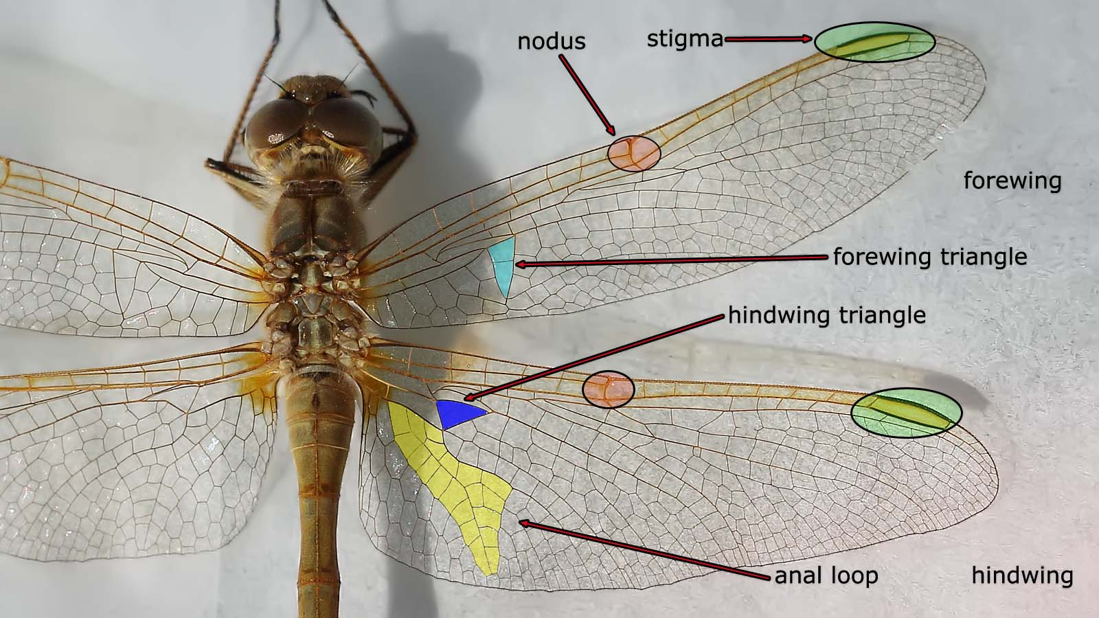 - Bucle anal (anal loop): Área en la parte inferior del ala posterior; asociada a la fuerza estructural y clave en la taxonomía de Odonata.