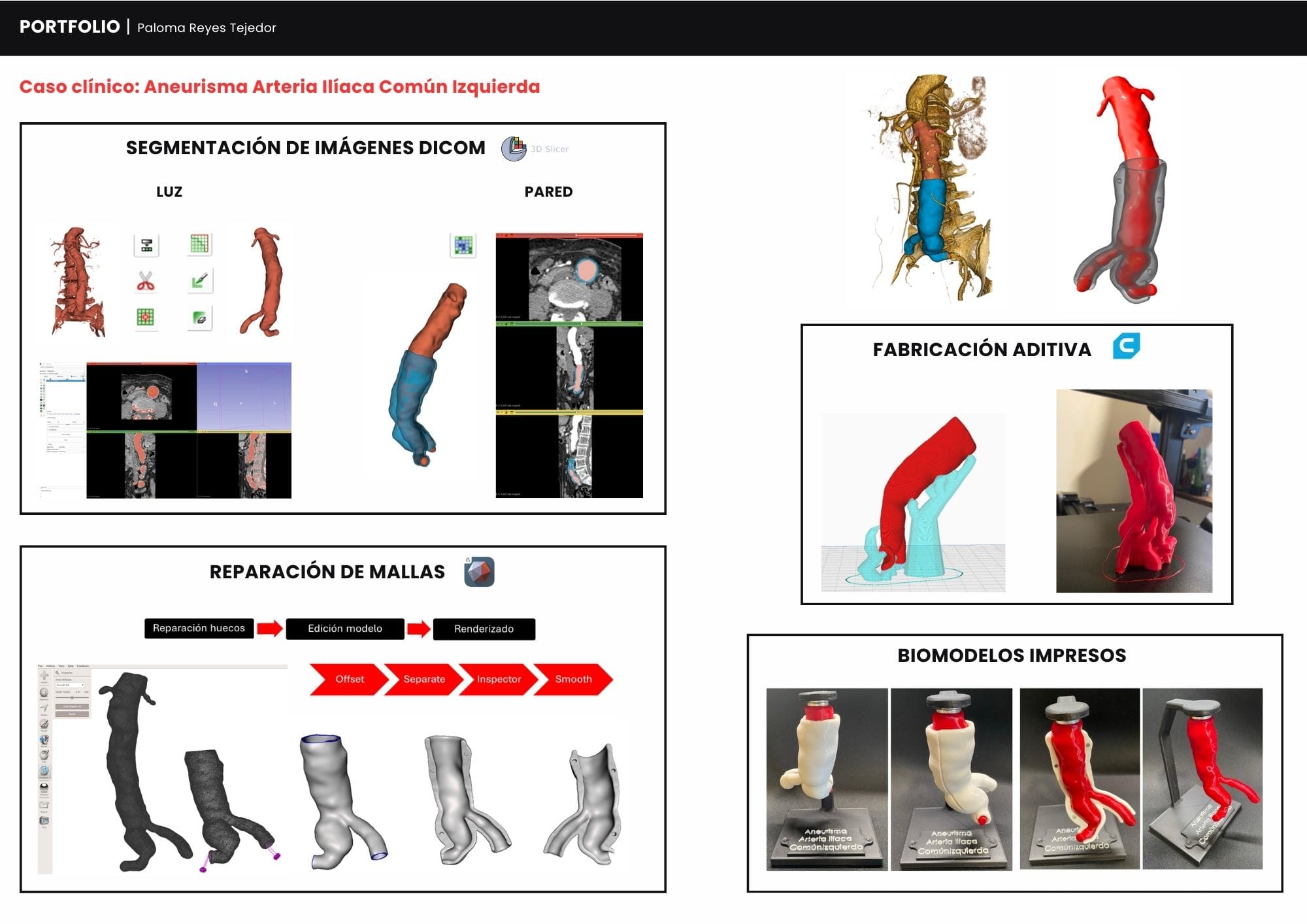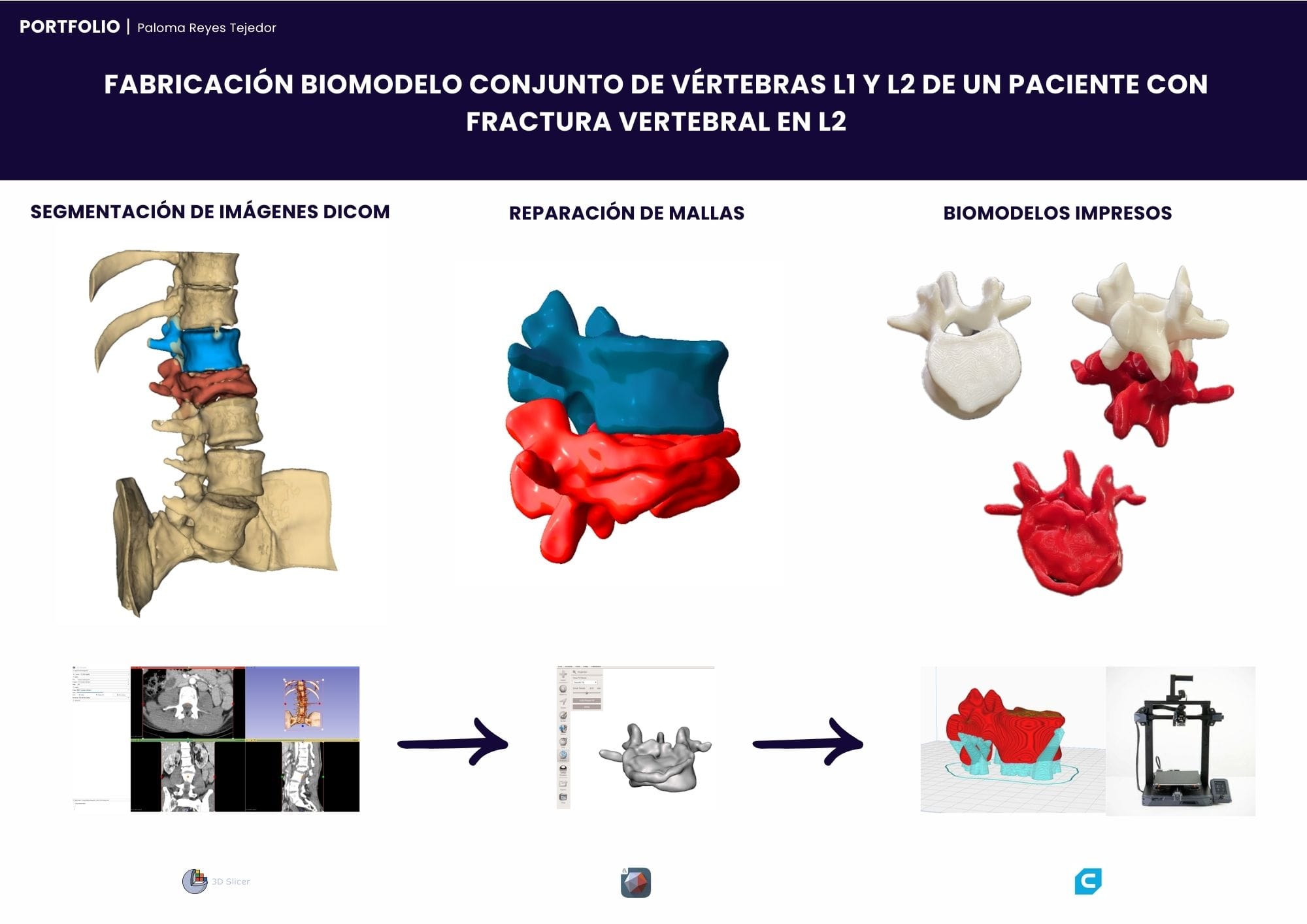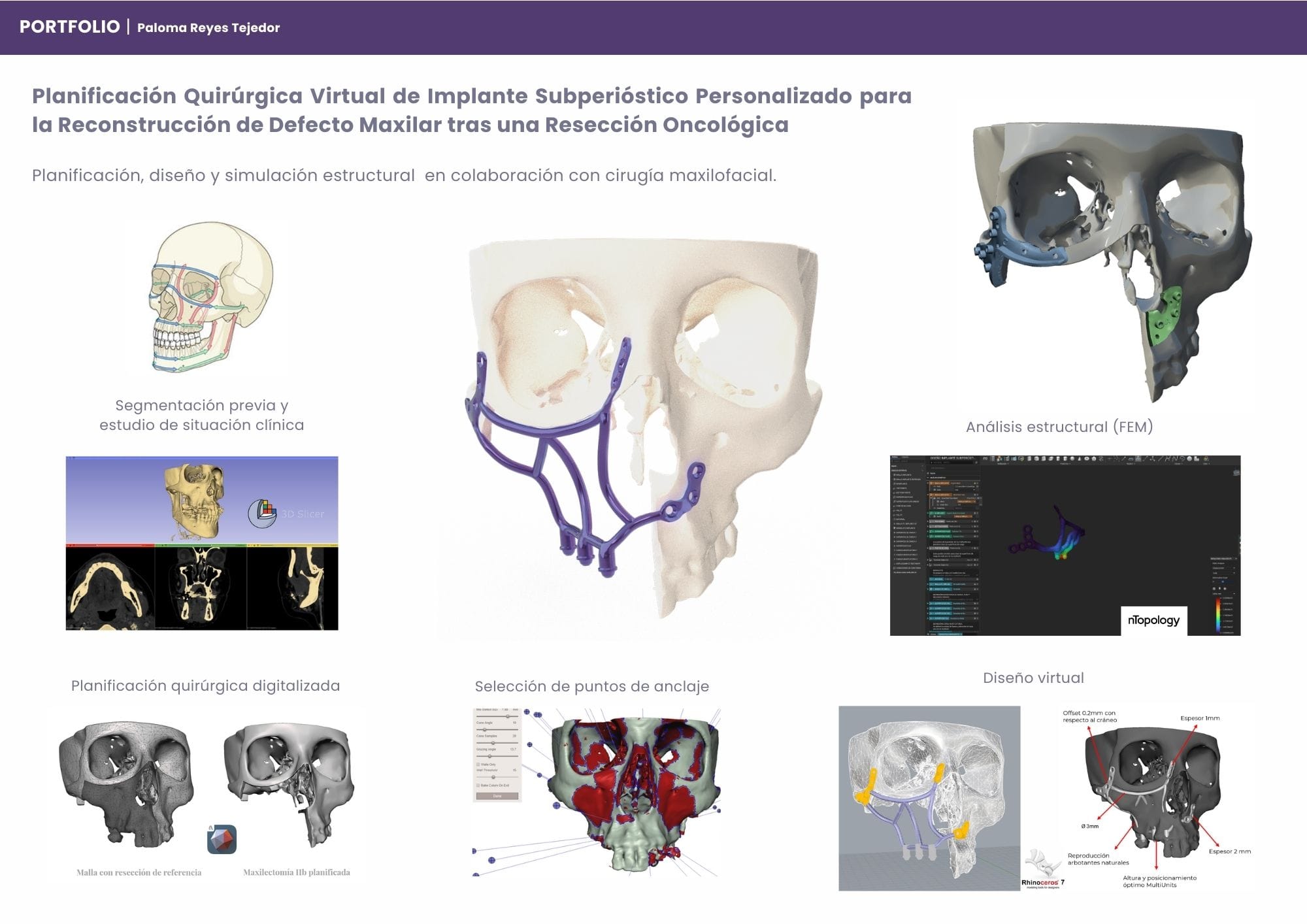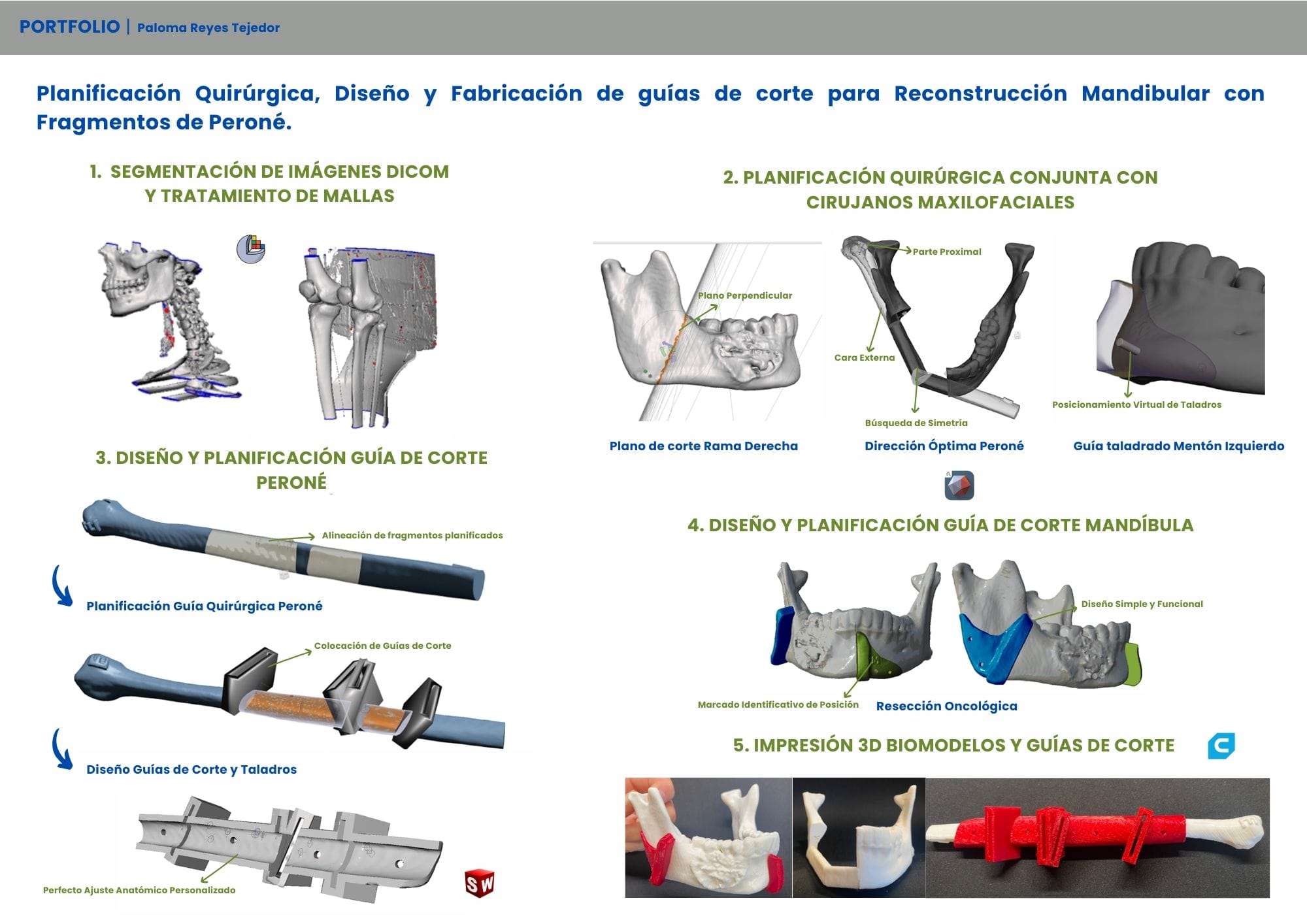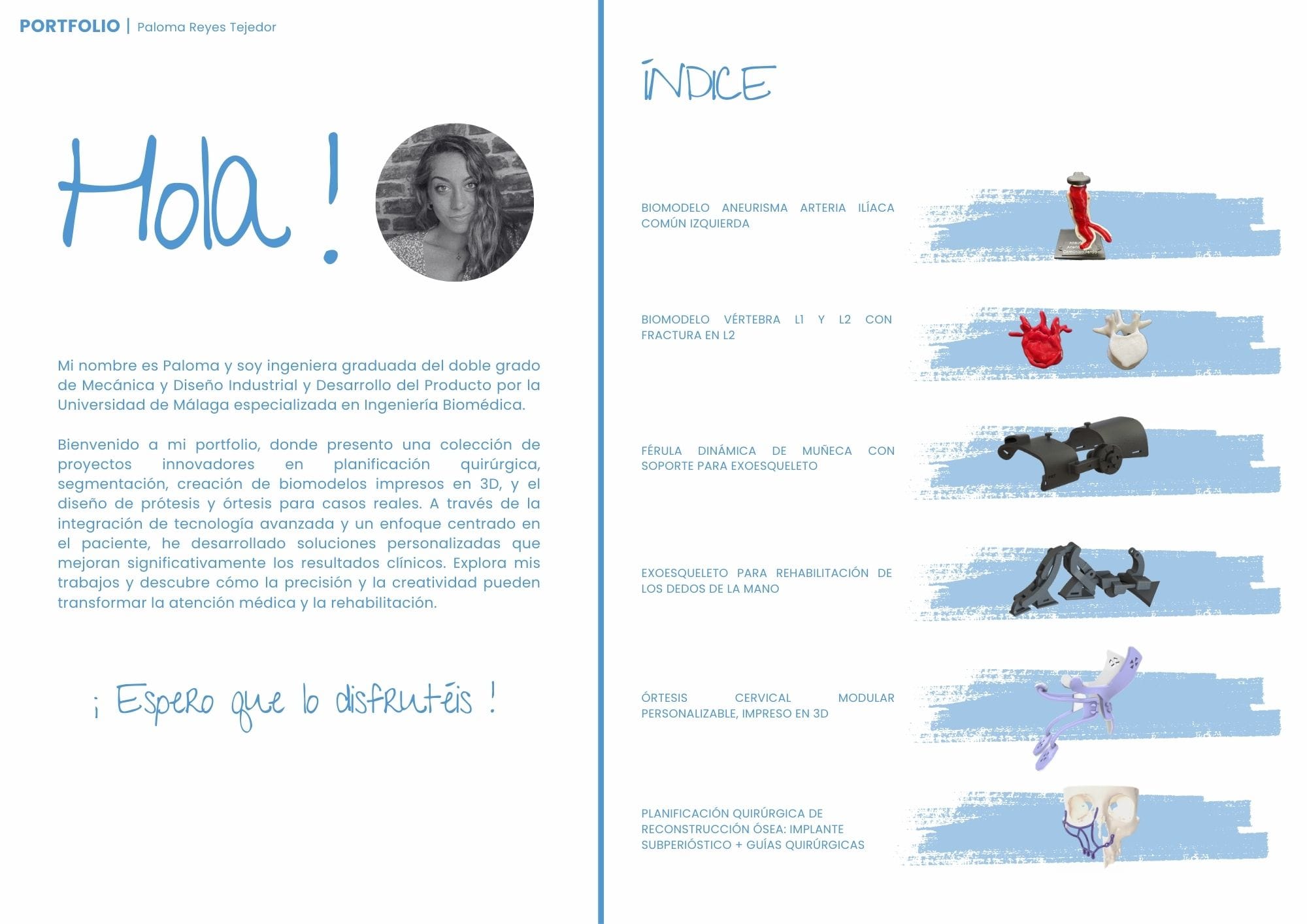 Actualmente trabajo como ingeniera biomédica especializada en cirugía guida en Medicalfit. Mi trabajo empieza leyendo imágenes DICOM y valorando junto al cirujano la mejor estrategia: desde aplicar conceptos de oseodensificación y decidir dónde colocar cada implante, hasta planificar regularizaciones óseas o injertos de encía. Pero no me quedo solo en la pantalla; diseño estructuras híbridas protésicas que luego cobran vida mediante impresión 3D o fresado en materiales como titanio, PEEK, circonio o PMMA.