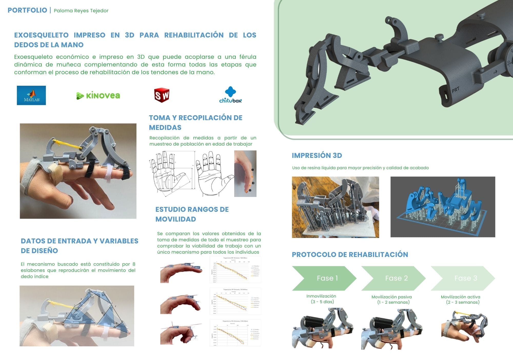 Sin embargo, la verdadera "luz" al final del túnel llegó con mi TFG. Me metí de lleno en el diseño de un exoesqueleto modular acoplable a una férula dinámica para rehabilitación de tendones de la mano y, por primera vez, mi trabajo no se quedaba sobre el papel. Empecé a colaborar con fisioterapeutas, a entender sus necesidades y a ver cómo la ingeniería podía simplificarles la vida a ellos y a sus pacientes. Ver que mis cálculos servían para que alguien recuperara movilidad y que además su fabricación no costase más de 10 euros con la impresión 3D fue el "clic" definitivo: no quería construir rascacielos, quería construir soluciones para personas. Ahí nació mi vena de Diseño Social.