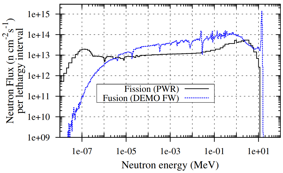 A continuación se compara el espectro de fisión de un conjunto combustible de un reactor LWR-P4 de 3,8 GW (gigavatios de potencia térmica) en Paluel, Francia, con el espectro de fusión calculado para el blindaje de la primera pared (FW) del reactor conceptual DEMO de 3,0 GW, los flujos de neutrones por intervalo de letargo son mayores en el espectro de fusión en todas las energías excepto en las térmicas.