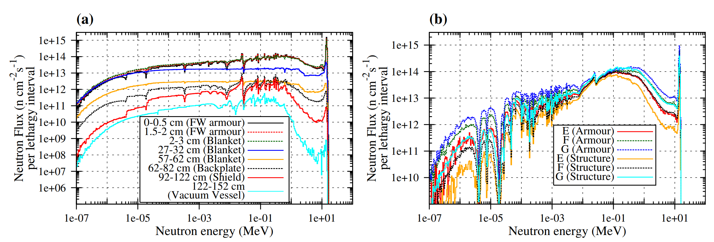 Comparación de los espectros de energía neutrónica en DEMO; (a) en función de la profundidad en la vasija desde la pared orientada hacia el plasma en la posición ecuatorial A de la figura 2; y (b) en las dos primeras capas del divertor en función de la posición (E-G en la figura 1).