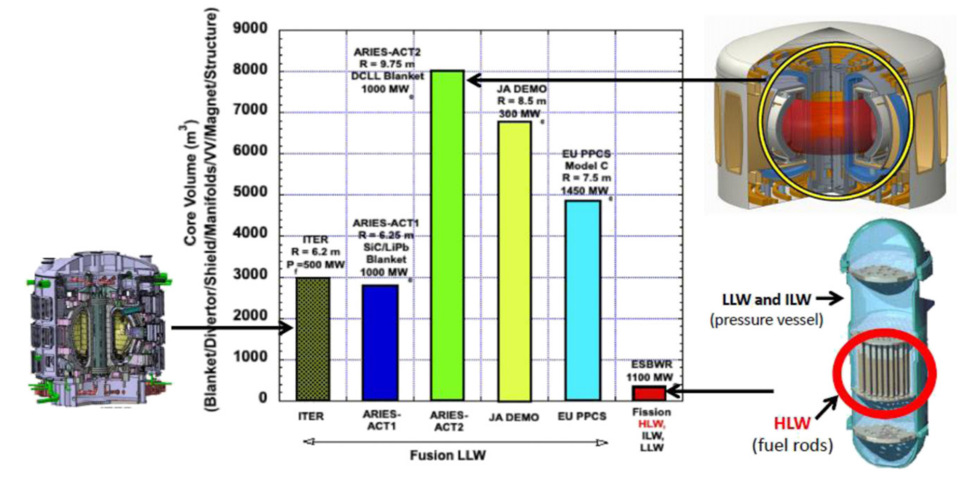 Figura 1. Volúmenes del núcleo de fusión de varias centrales de fusión nuclear y ESBWR (estimación de residuos de EE. UU.). Cabe señalar que se trata de los volúmenes del núcleo y no de la generación de residuos a lo largo de la vida útil, incluidos los residuos del desmantelamiento y el equilibrio de la central.