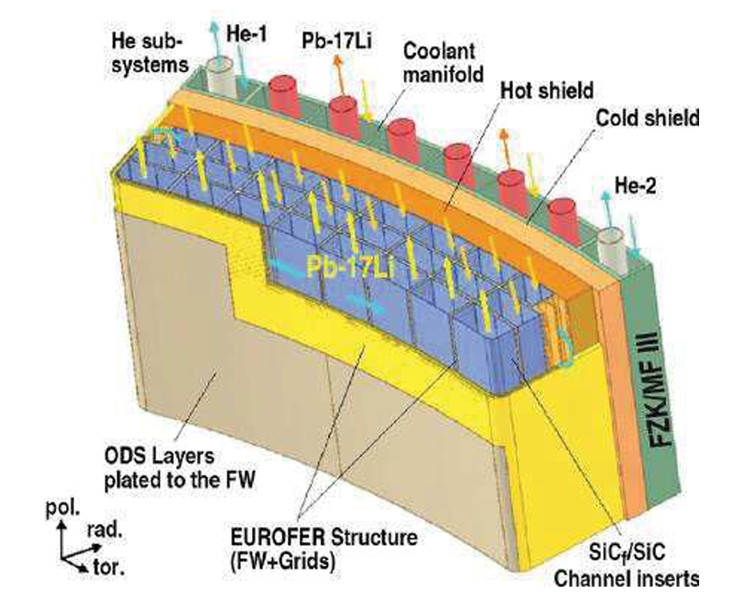 Esquema de la envoltura reproductora del tritio Dual-cooled, donde se puede apreciar el empleo de EUROFER para la primera pared y los grids, así como SiC para los canales internos.