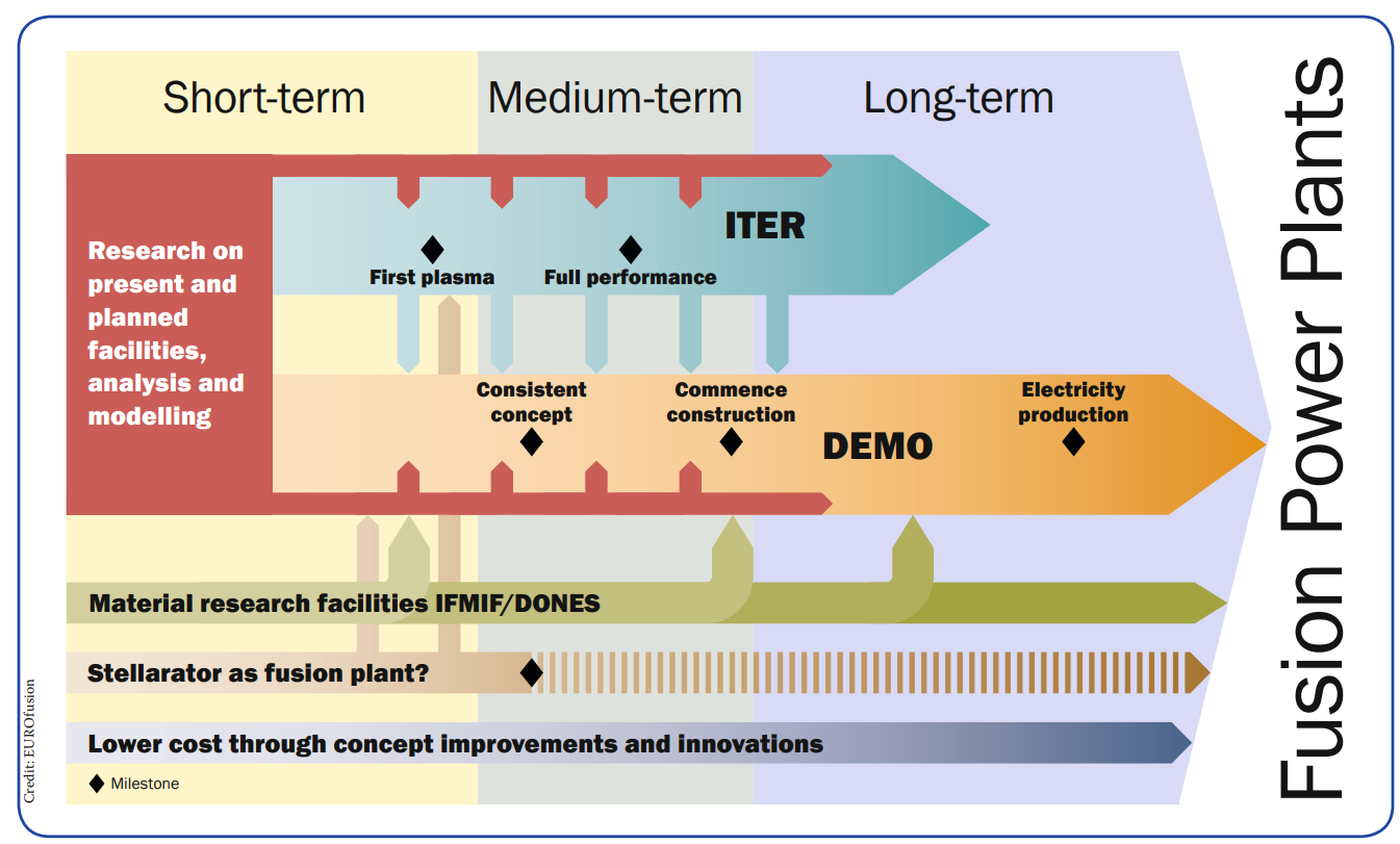 La hoja de ruta europea para la fusión nuclear donde se puede ver el solape entre proyectos, incluido IFMIF-DONES que coexistirá con los reactores de fusión actuales, ITER (en construcción) y con DEMO (en fase de desarrollo).