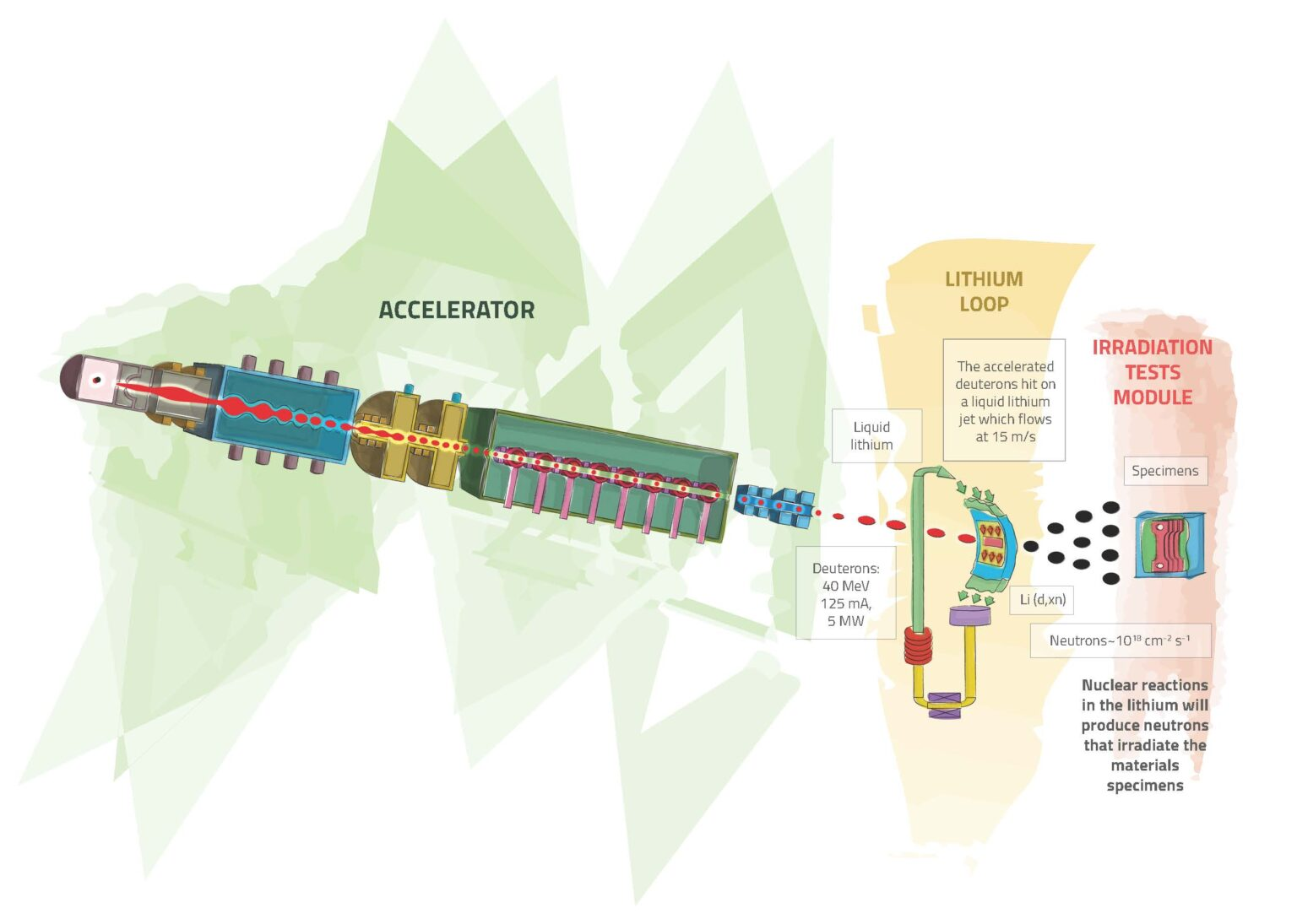 La instalación producirá un haz de deuterones de 125 mA, acelerado hasta 40 MeV y conformado para tener una sección transversal nominal en el rango de 100 mm x 50 mm a 200 mm x 50 mm, que incidirá sobre un blanco de litio líquido de 25 mm de espesor que fluye transversalmente a unos 15 m/s delante de él. Las reacciones de desprendimiento generan un gran número de neutrones que interactúan con las muestras de materiales situadas inmediatamente detrás del objetivo de litio, en los módulos de ensayo. Crédito: ifmif-dones.es