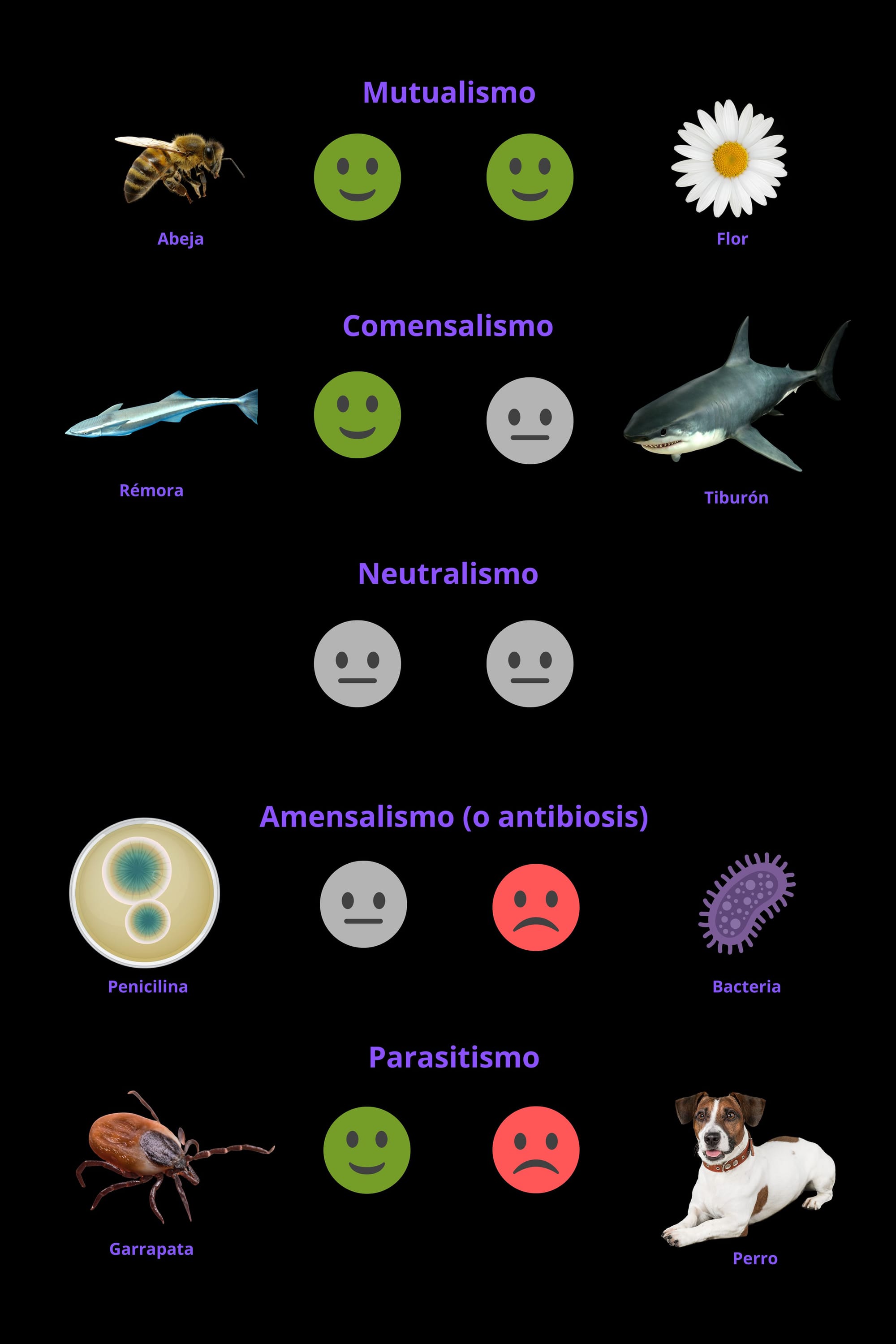 Uno de los organismos (parásito) se beneficia a costa del otro (hospedador), causándole algún daño. Ejemplo: Las garrapatas en los mamíferos: la garrapata se alimenta de la sangre del hospedador, lo que puede debilitarlo y transmitirle enfermedades.
