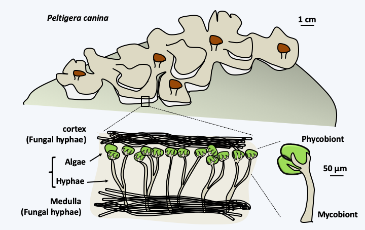Estructura del liquen Peltigera canina. Crédito: https://uu-microbial-eukaryotes.github.io/ebook/book/Part1/major_events/sections/symbiosis.html