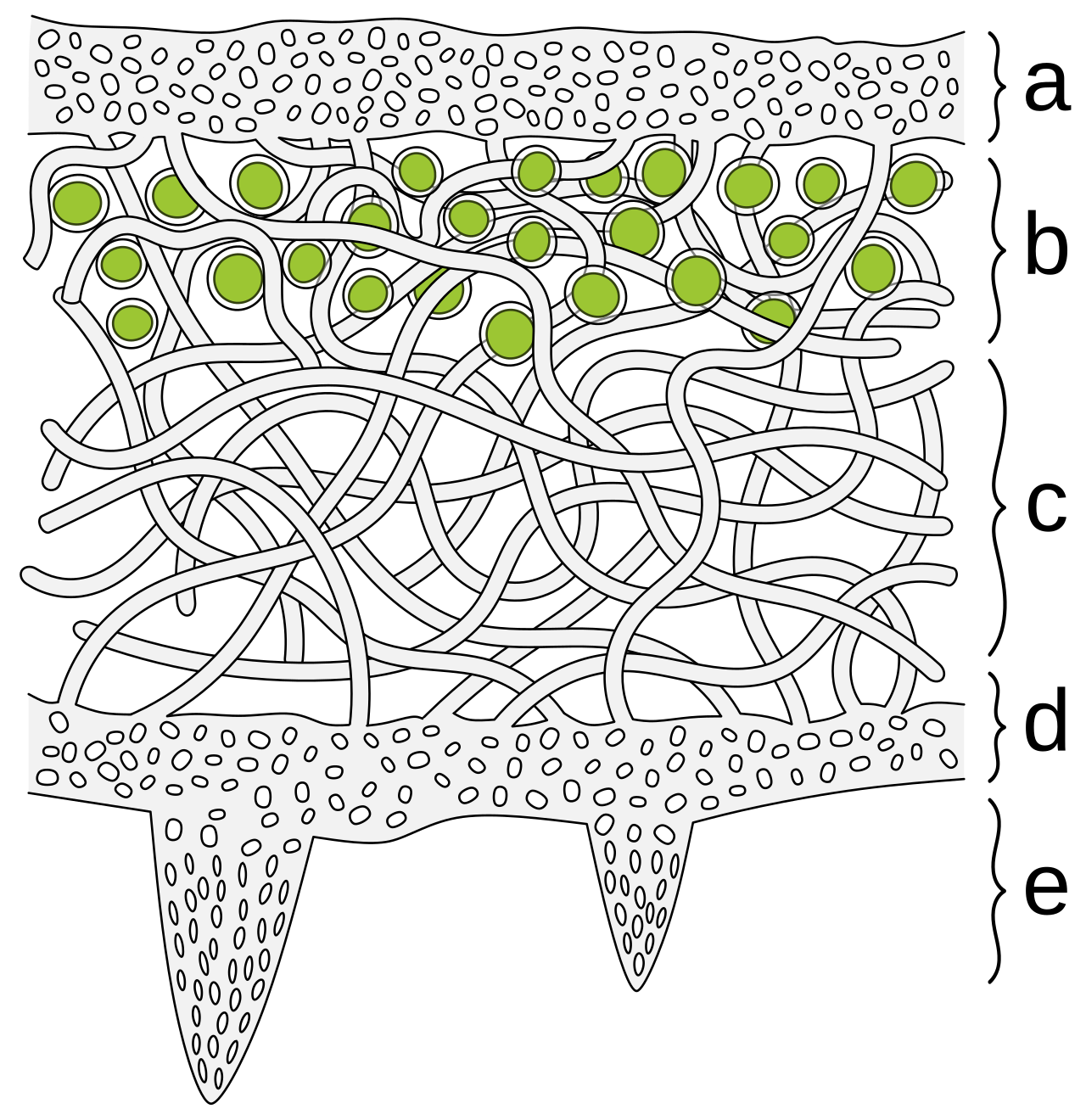Sección transversal esquemática de un liquen foliáceo: (a) La corteza es la capa externa de filamentos fúngicos (hifas) entrelazados (b) Esta capa fotobiótica contiene algas verdes fotosintéticas (c) Hifas poco compactas en la médula (d) Una corteza inferior entrelazada (e) Hifas de anclaje llamadas rizinas, donde el hongo se adhiere al sustrato. Crédito: https://en.wikipedia.org/wiki/Lichen#/media/File:Lichen_cross_section_%E2%80%93_heteromeric_thallus.svg