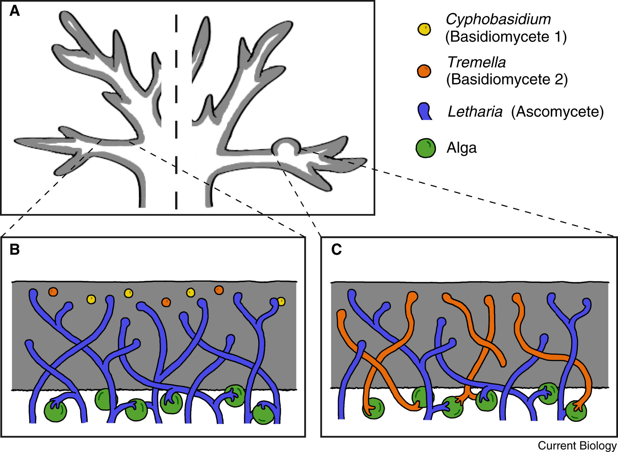 además del ascomiceto principal y del alga fotosintética, la mayoría de las muestras (86%) contenían ADN de al menos dos hongos basidiomicetos diferentes, uno de ellos perteneciente al género Tremella.