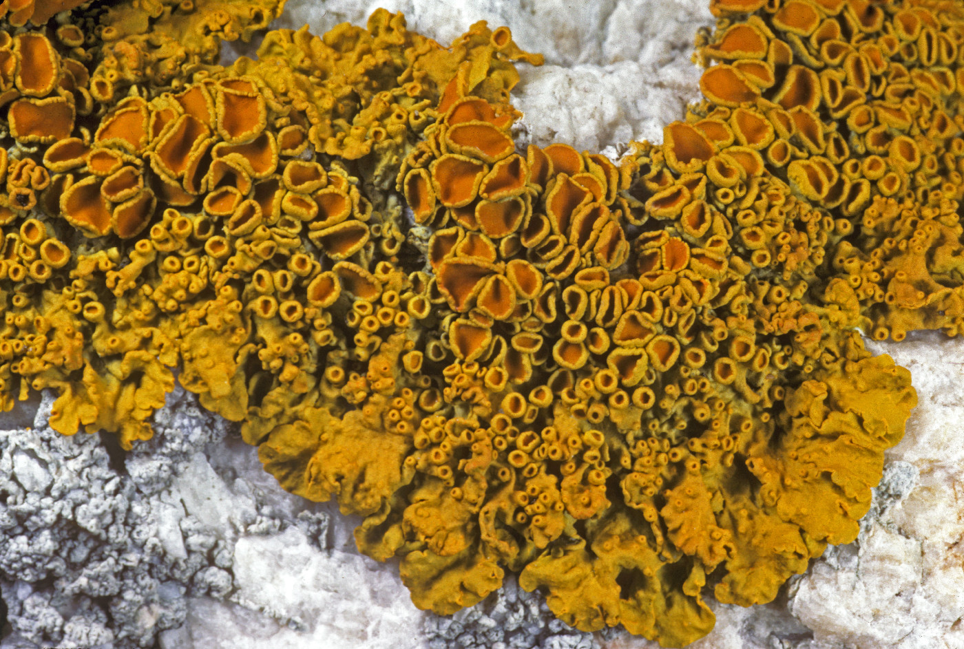 Xanthoria parietina. Crédito: https://media01.symbiota.org/media/lichens/Sharnoff_FieldObs/Xanthoria-parietin/Xanthoria-parietina_4_Sharnoff_1090_07.jpg